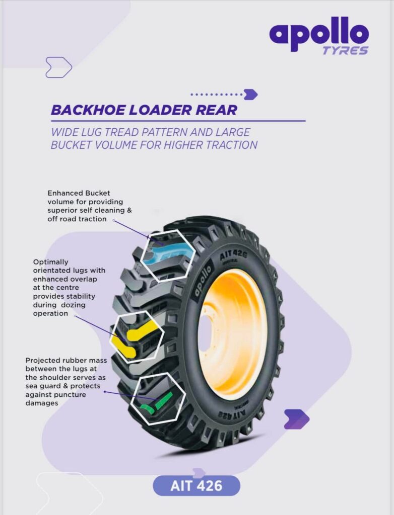 The Apollo Backhoe Loader Rear AIT426 is a durable tyre designed for backhoe loaders and other heavy construction equipment. It provides excellent traction, stability, and load-carrying capacity on rough construction sites, gravel roads, and uneven terrains.